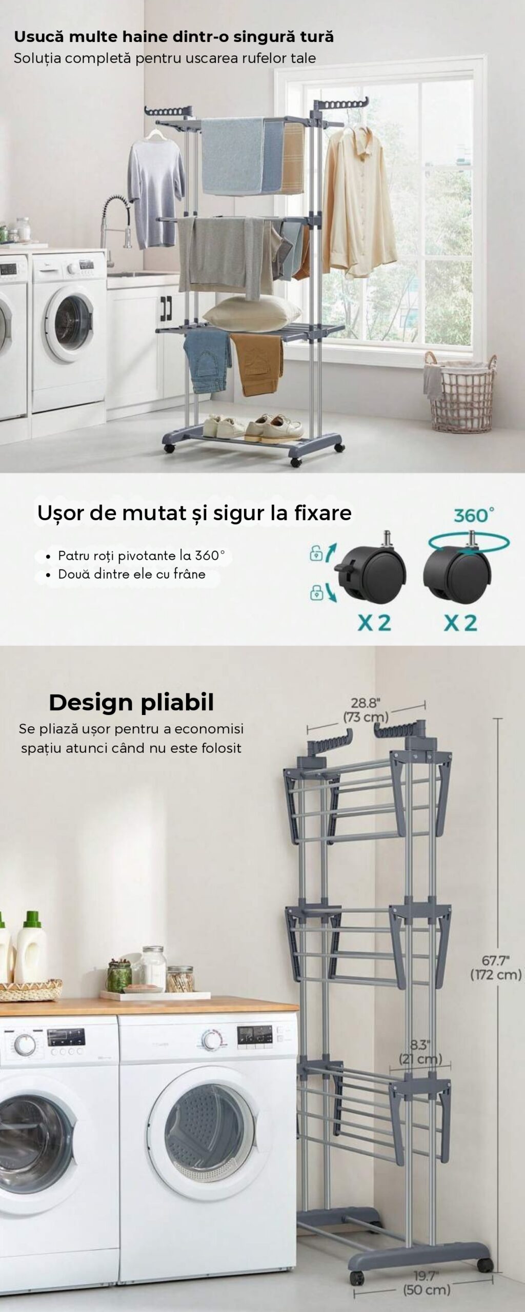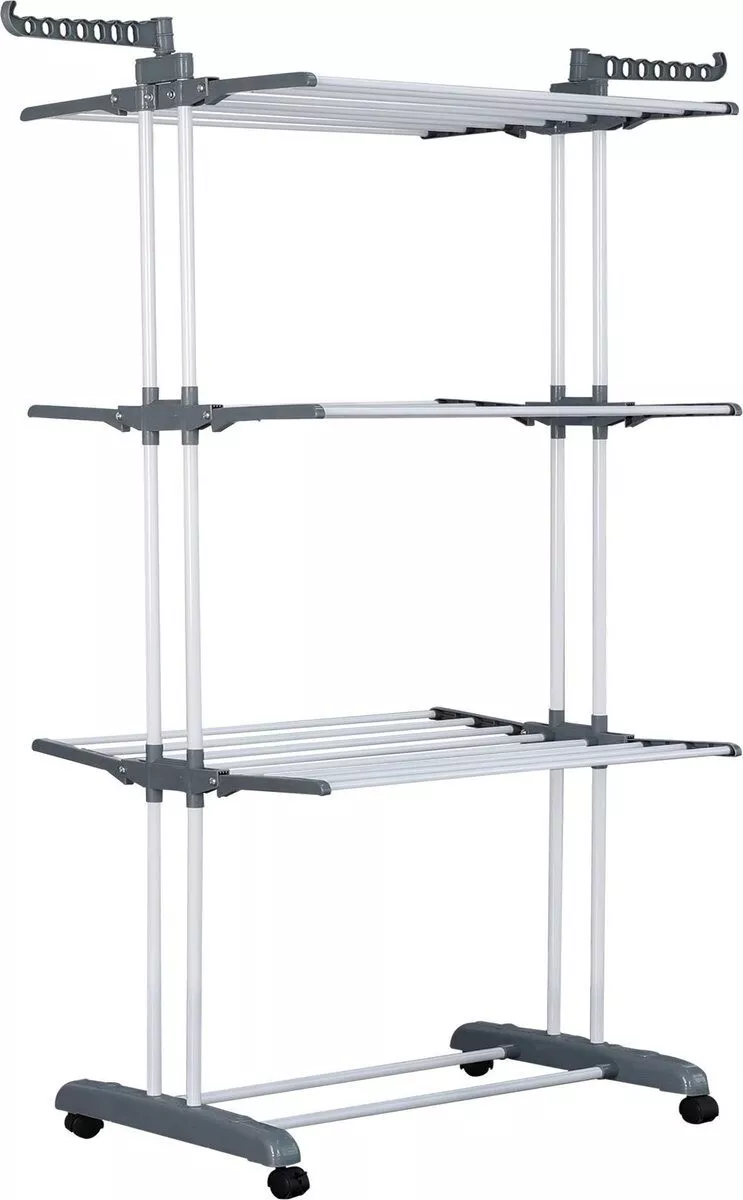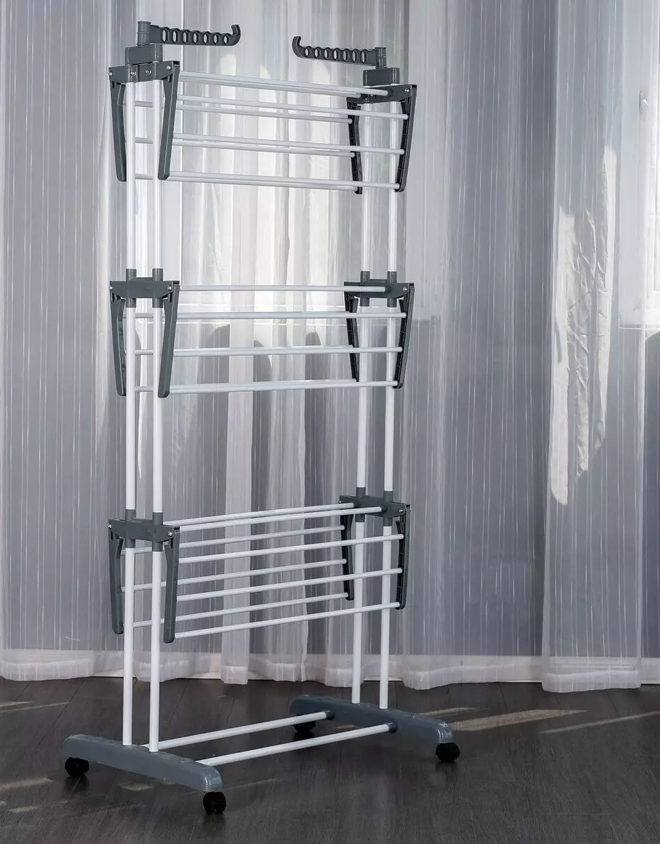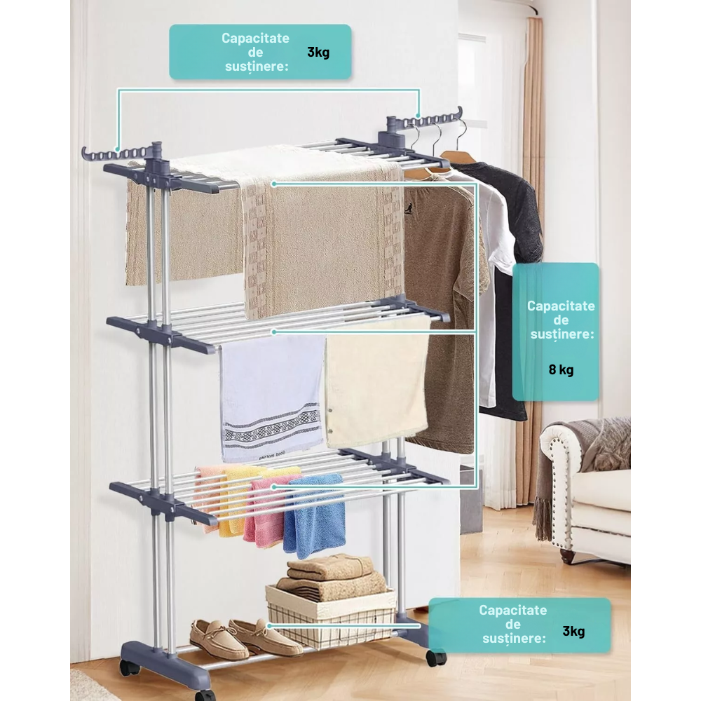 Supradimensionat pe 3 nivele – Dimensiuni: 172 cm inaltime × 50 cm latime × 76 cm lungime. Design cu 3 nivele si 2 carlige laterale pentru uscarea prosoapelor, sosetelor, hainelor, pantofilor, pilotelor etc. Dispune de 24 de stalpi si 14 carlige pe cele doua aripi laterale pentru uscari suplimentare. Poate sustine pana la 62 de articole – suficient pentru hainele intregii familii.