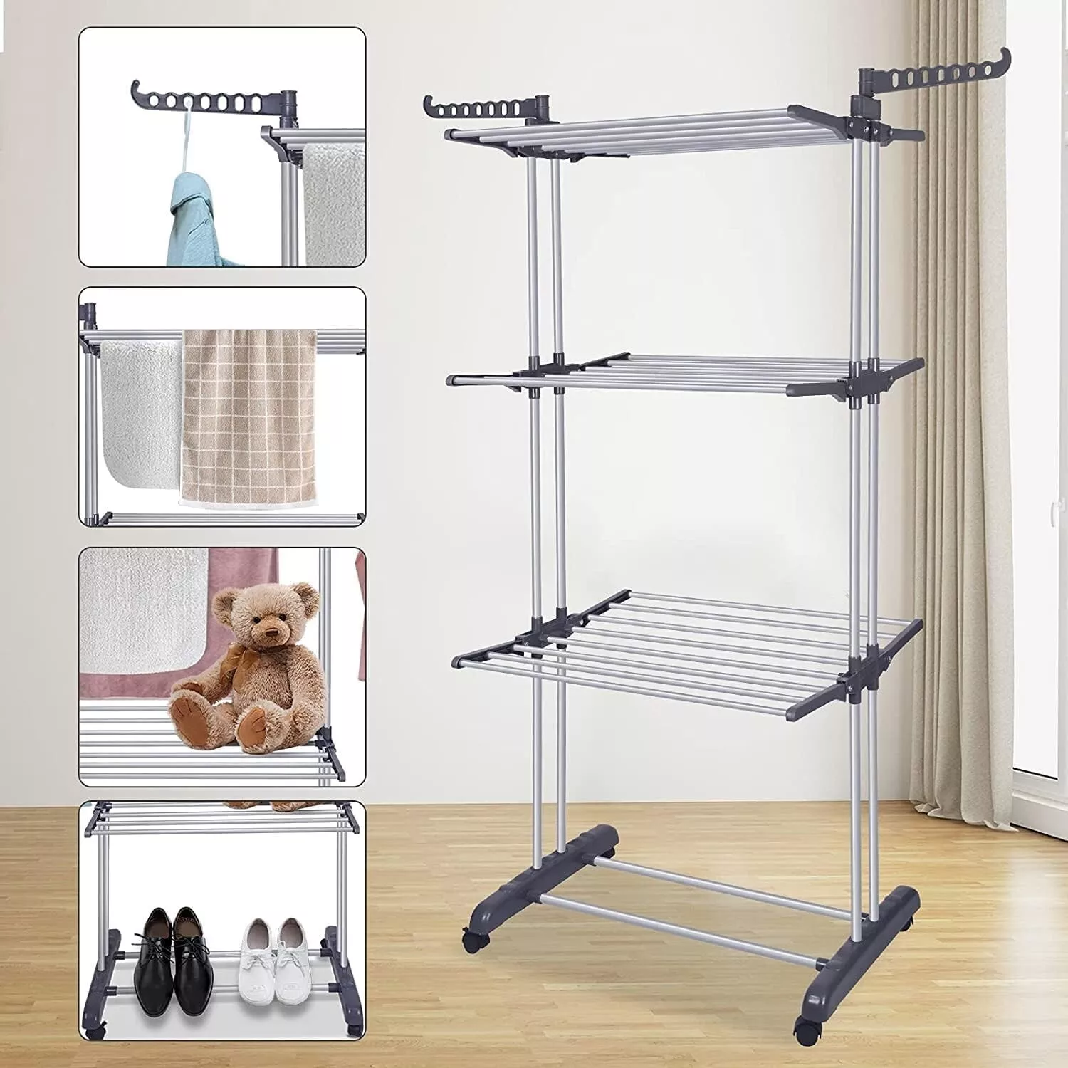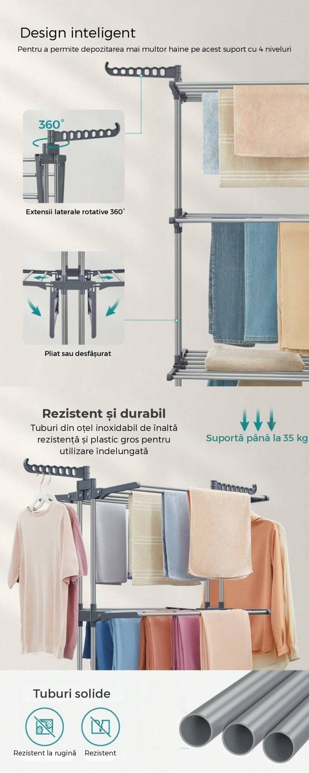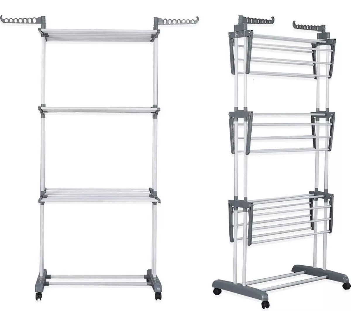 Supradimensionat pe 3 nivele – Dimensiuni: 172 cm inaltime × 50 cm latime × 76 cm lungime. Design cu 3 nivele si 2 carlige laterale pentru uscarea prosoapelor, sosetelor, hainelor, pantofilor, pilotelor etc. Dispune de 24 de stalpi si 14 carlige pe cele doua aripi laterale pentru uscari suplimentare. Poate sustine pana la 62 de articole – suficient pentru hainele intregii familii.