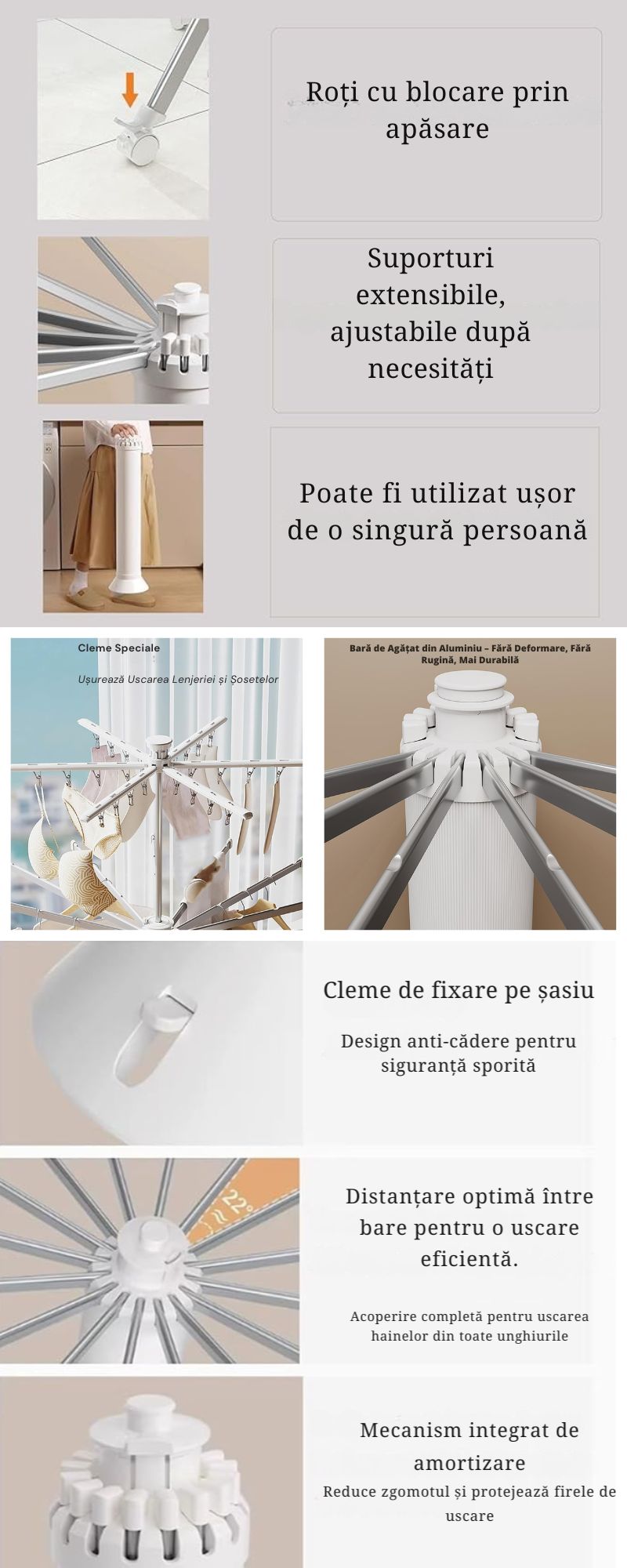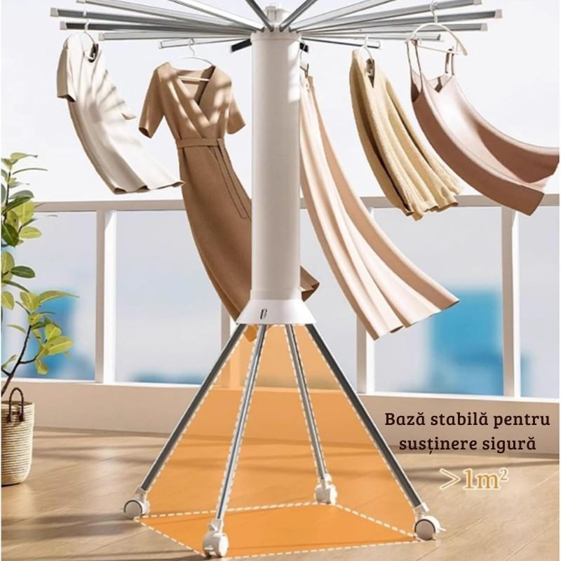Structura pe doua niveluri: Include 16 brate pe nivelul inferior si 6 brate pe nivelul superior. Fiecare brat are 4 orificii antialunecare care impiedica alunecarea hainelor de pe suport. Poate sustine tricouri, prosoape, halate de baie, lenjerie sau sosete.